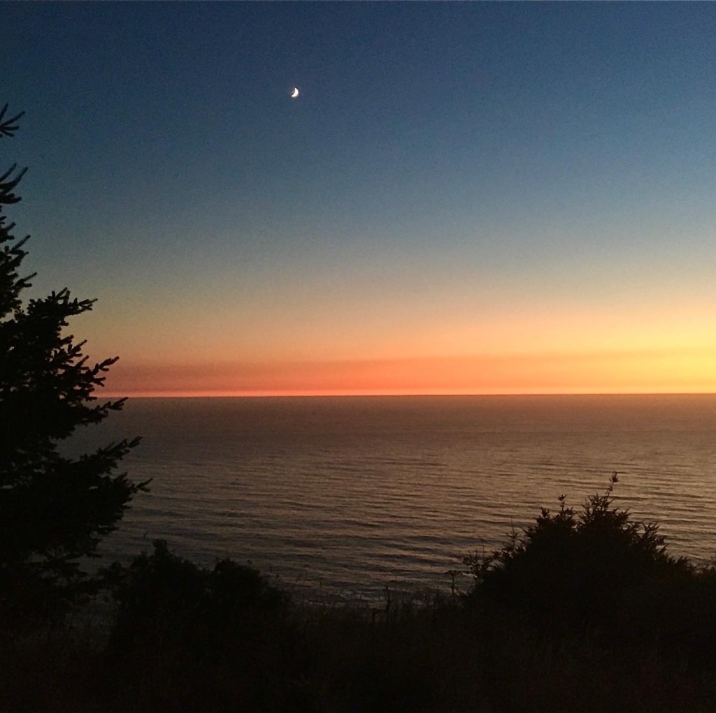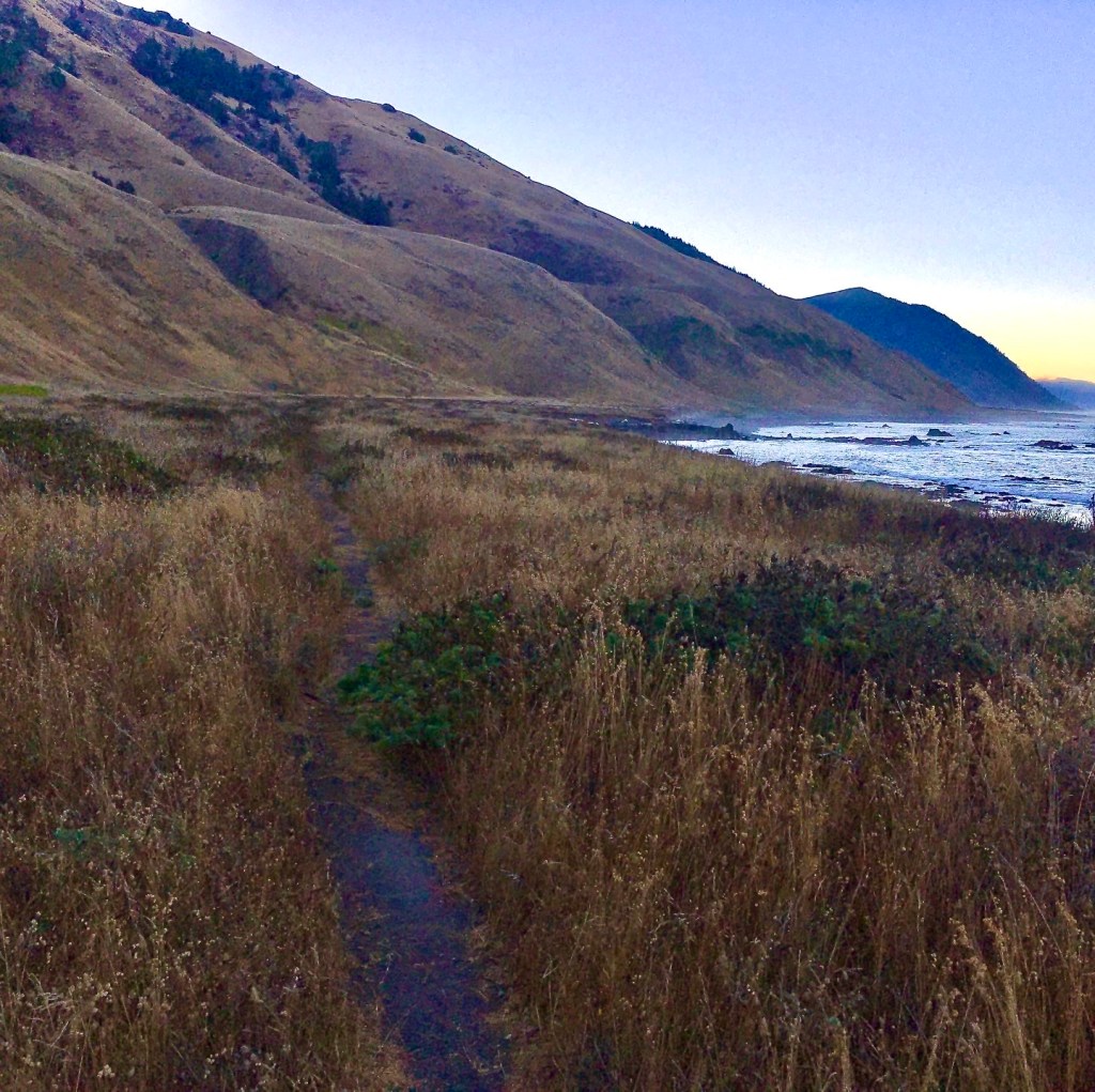 Happy to be back on the right track, I finished the climb’s last stretch as the trail opened up to grassland on the cliff sides above the ocean. The trail here crosses up and down the cliffside, narrow and covered in brush with short but steep sections that seem to cut back on itself in many places. The sky was clear; the crescent moon was rising into the sky, the stars were starting to come out, and there was a vivid deep red, pink line of color on the horizon. Breathtaking is an understatement. Then the booming of fireworks and gunshots could be heard far off in the direction of Usal Breach. I even saw what I believe was a military flare shot into the sky as a ball of white light hung over the ocean in the distance for several minutes before twinking and fading out. I wondered what kind of shenanigans was happening on the beach.