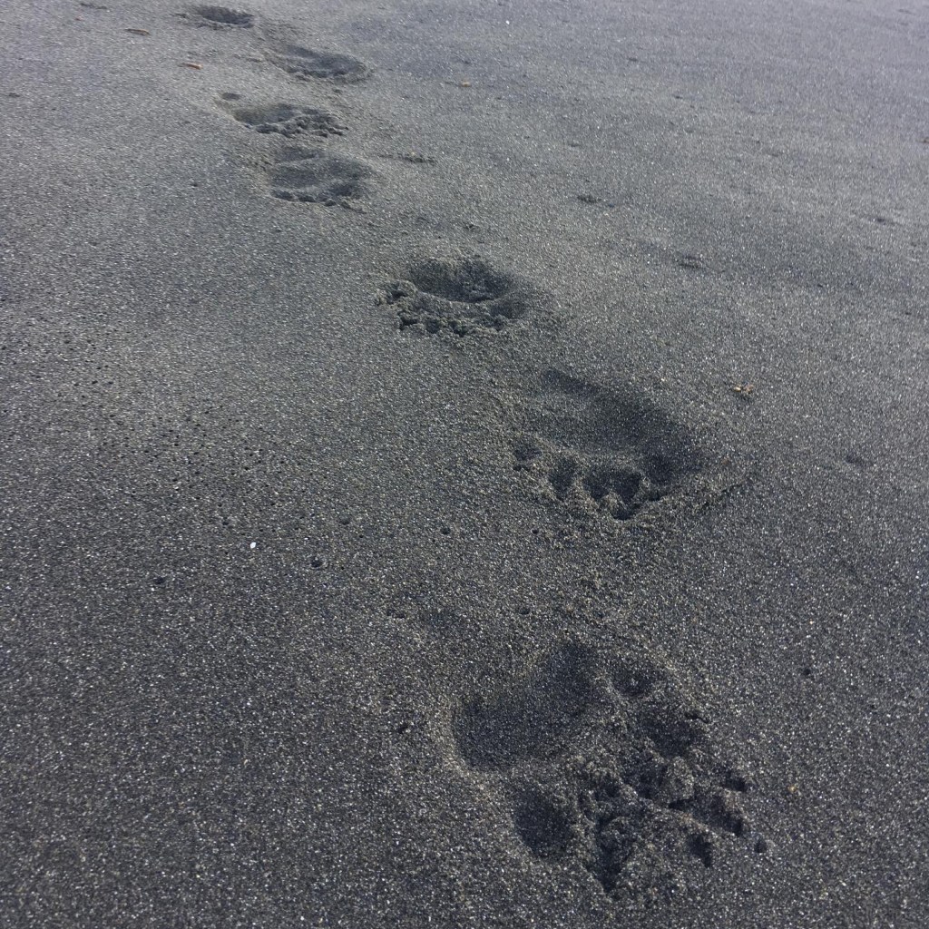 Not realizing that I had reached Randall creek, I blew past the dry land opportunity onto the Spanish Flat trail. It did not take me long to realize my mistake, and after maybe a quarter mile, I turned back for the creek. I should have known better as several tents were set up where Randall Creek dumped onto the beach. I tiptoed through the tents as campers were beginning to stir and quickly found the trail leading up to Spanish Flat. The trail here climbs a little bit before weaving its way across the flat plateau above the beach, and I settled into a good pace and soaked in the morning and the views as the miles melted away. I passed a few cabins and creek crossings and saw a hunter up further up the plateau. I heard his rifle go off before I saw him as I approached Spanish Creek but could not see what he was shooting at up the ridge. He never saw me as he headed up toward the direction he had fired, and I continued across the creek to continue my journey. As the flats ended and I was dumped back down on the beach, I came across a line of bear tracks pressed into the sand headed toward me and continuing down the coast. The prints were rather large and looked fresh; I wondered how long it had been since the bear had passed.
